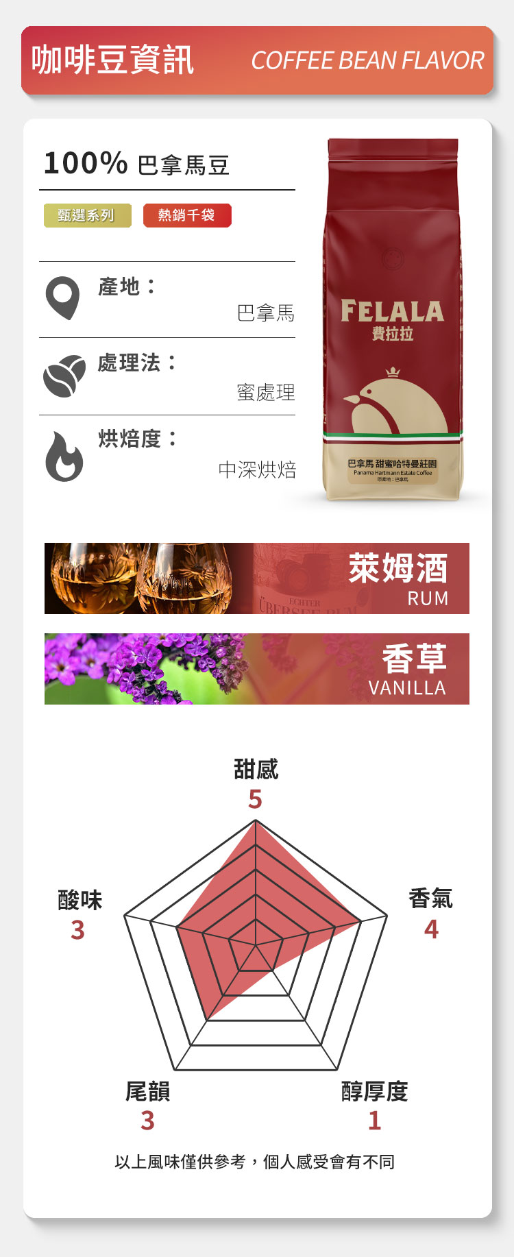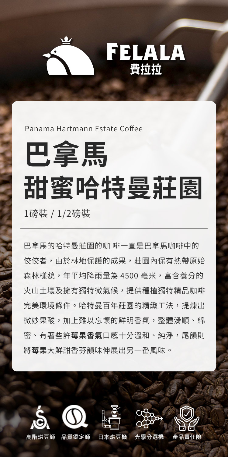 巴拿馬哈特曼百年莊園的精緻工法,提煉出微妙果酸,一磨開就散發超濃水果酒香氣,加上難以忘懷的鮮明香氣,整體滑順、綿密、有著些許奶油香氣的蜜處理口感十分溫和有著深沈的酒釀葡萄與李子的滋味,純淨,尾韻則將莓果鮮甜香芬韻味伸展出另一番風味,口感清爽甜度也相對高。