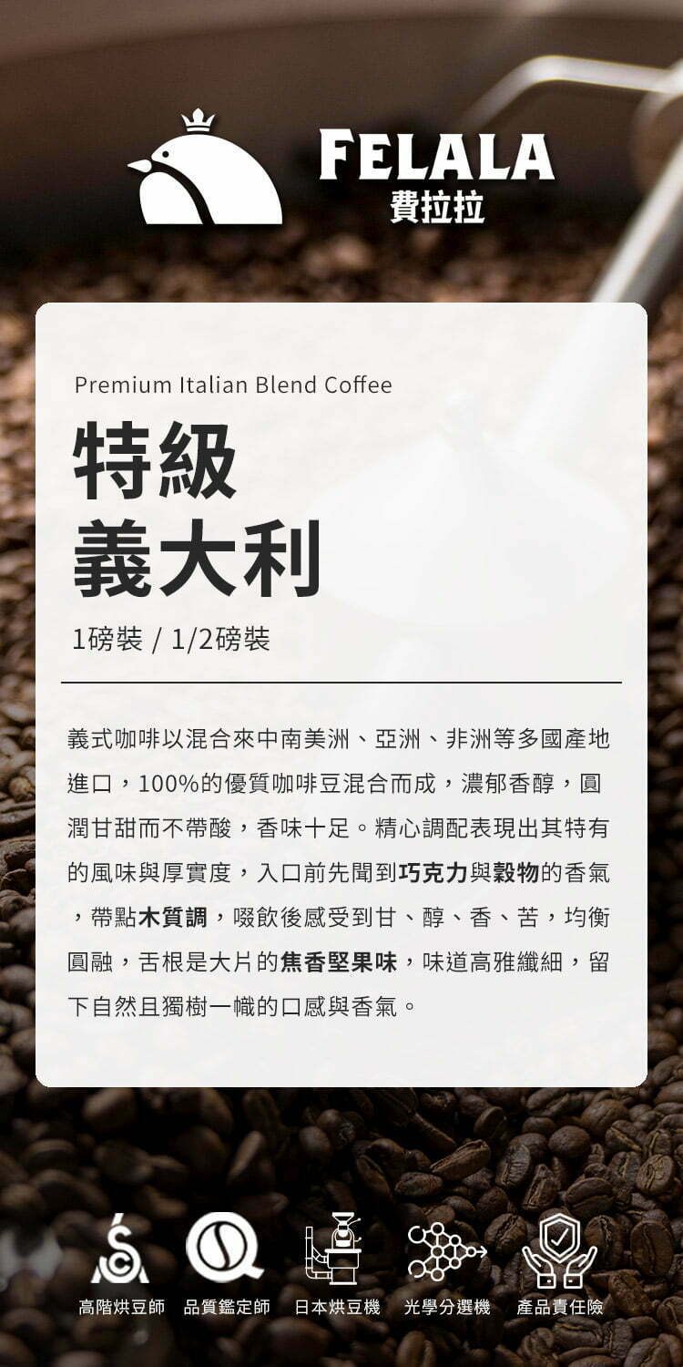 費拉拉【費拉拉】【中深烘焙】特級 義大利 咖啡豆[rev_slider alias=”felala-coffee-01″][/rev_slider][rev_slider alias=”felala-coffee-02″][/rev_slider][rev_slider alias=”felala-coffee-03″][/rev_slider][rev_slider alias=”felala-coffee-04″][/rev_slider]關於費拉拉-專業尋豆師-SCA高階烘豆師-Q-grader品質鑑定師-因為我們熱愛咖啡費心處理咖啡費拉拉-包裝說明-不透光鋁箔袋-單向排氣閥-確保咖啡豆新鮮