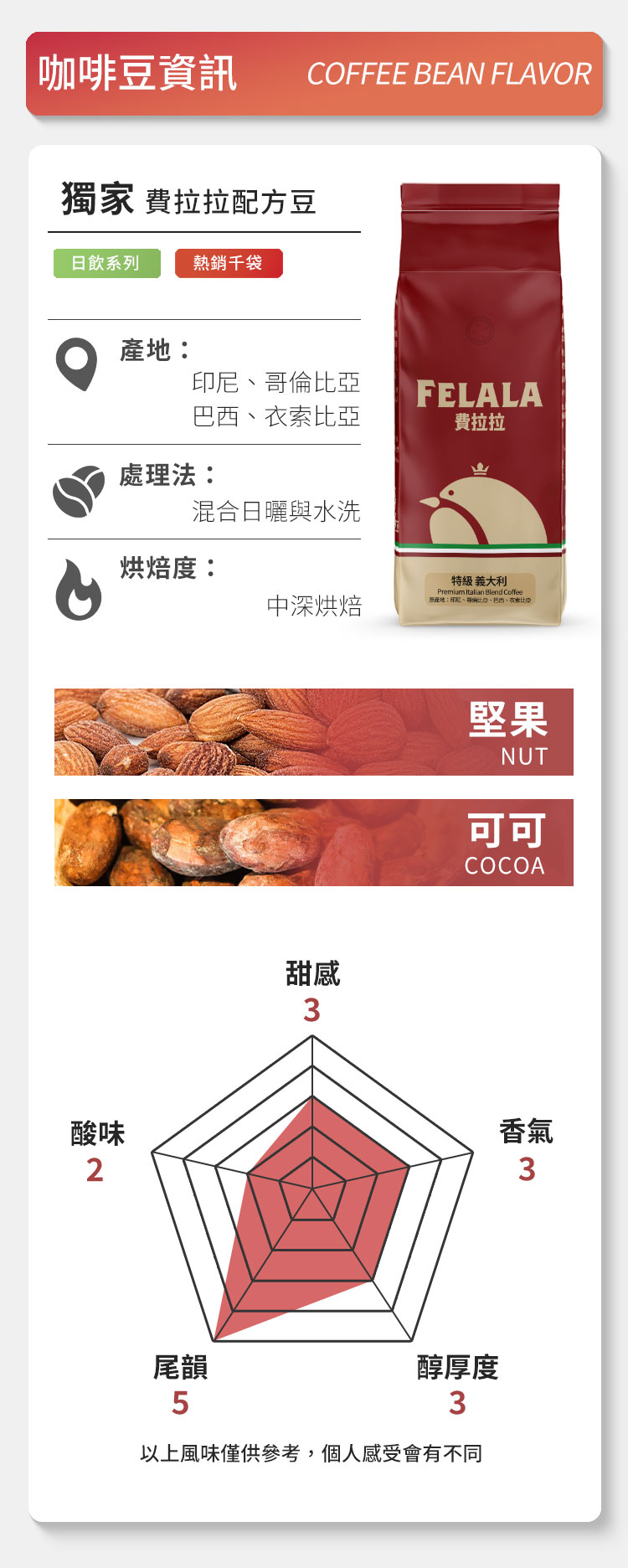 費拉拉評測以混合中南美洲、洲等多國產地進口,100%的優咖啡豆混合而成