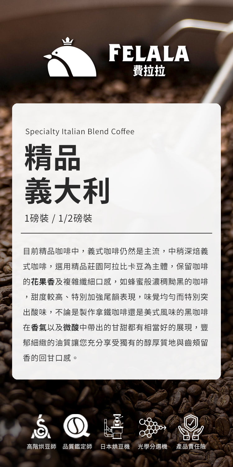 費拉拉堅持採用莊園嚴選咖啡豆、由專業高階SCA烘豆師進行烘焙