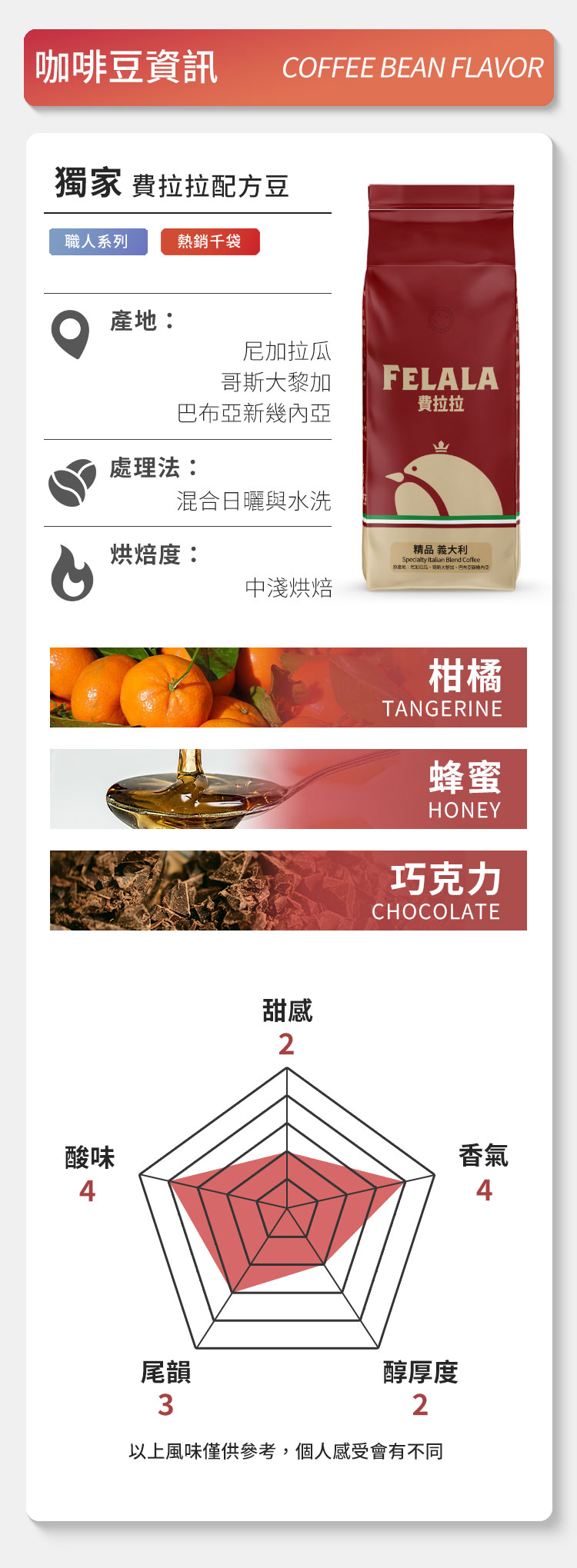 目前精品咖啡中,義式咖啡仍然是主流,中稍深焙義式咖啡,選用精品莊園阿拉比卡豆為主體,保留咖啡的花果香及複雜纖細口感,如蜂蜜般濃稠黝黑的咖啡,甜度較高、特別加強尾韻表現,味覺均勻而特別突出酸味,不論是製作拿鐵咖啡還是美式風味的黑咖啡在香氣以及微酸中帶出的甘甜都有相當好的展現,豐郁細緻的油質讓您充分享受獨有的醇厚質地與齒頰留香的回甘口感。