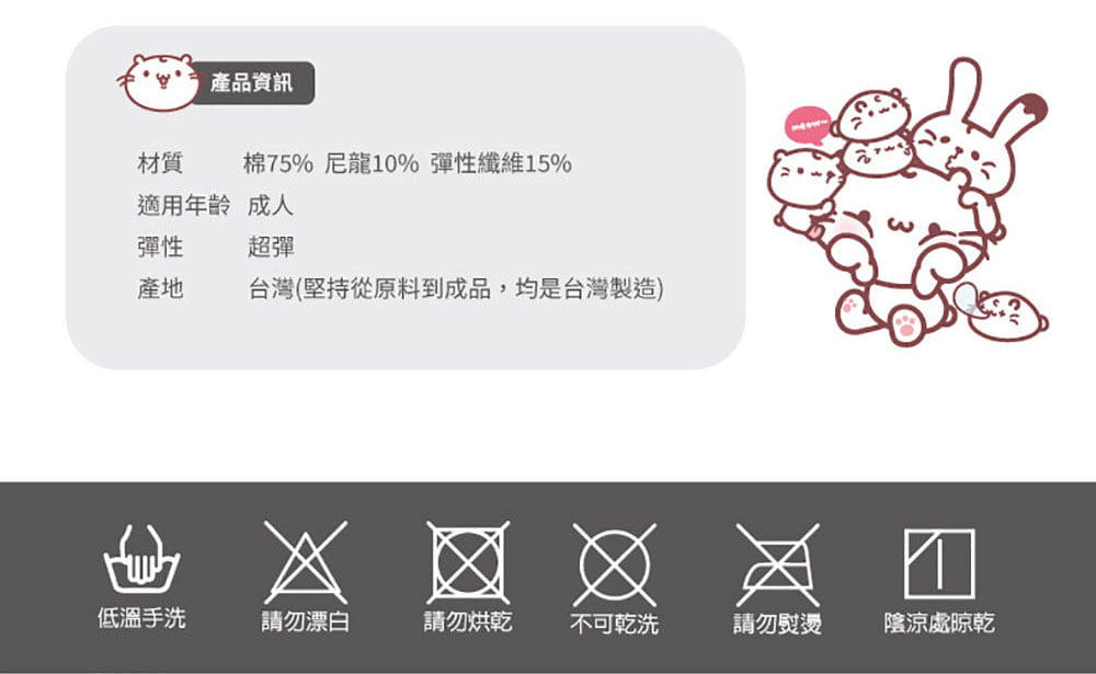 棉 75%, 尼龍 10%, 彈性纖維 15% |