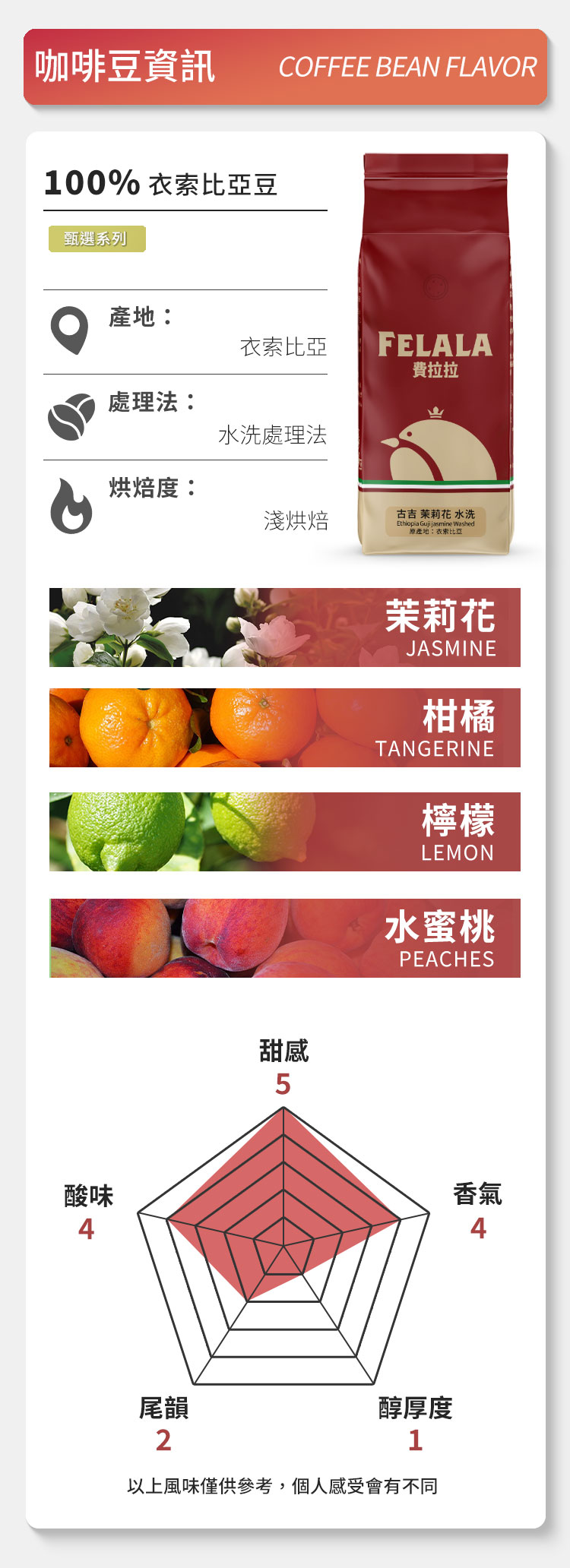 費拉拉【費拉拉】【淺烘焙】古吉 茉莉花 水洗 咖啡豆[rev_slider alias=”felala-coffee-01″][/rev_slider][rev_slider alias=”felala-coffee-02″][/rev_slider][rev_slider alias=”felala-coffee-03″][/rev_slider][rev_slider alias=”felala-coffee-04″][/rev_slider]關於費拉拉-專業尋豆師-SCA高階烘豆師-Q-grader品質鑑定師-因為我們熱愛咖啡費心處理咖啡費拉拉-包裝說明-不透光鋁箔袋-單向排氣閥-確保咖啡豆新鮮