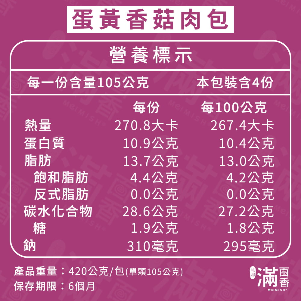 麵粉、豬絞肉(台灣)、水、老麵酵母種(麵粉、水、即溶快發乾酵母)、蛋黃、蔥、糖、醬油、香菇、鹽、玉米粉、紅麴米、棕櫚油、五香粉、白胡椒粉、花椒粉、葫蘆巴、碳酸氫鈉(小蘇打) |