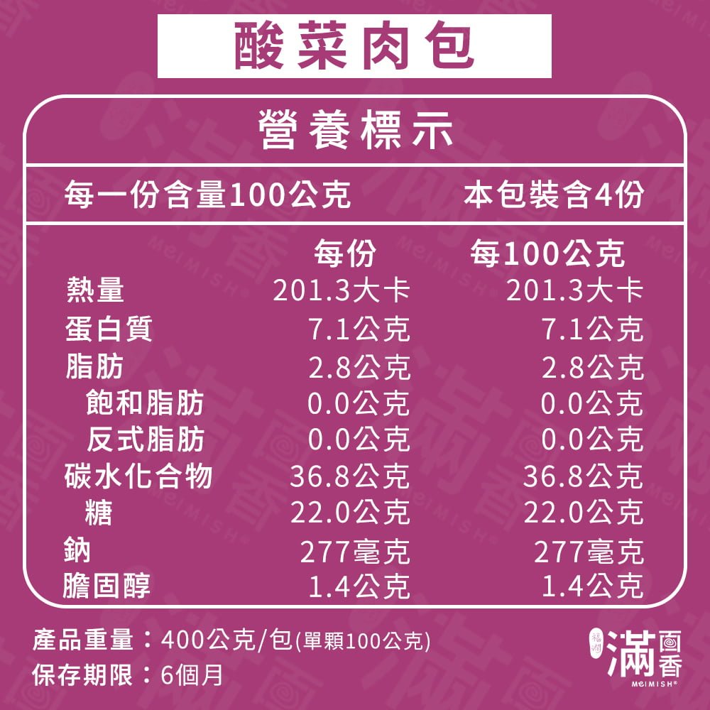 麵粉、酸菜、豬絞肉(台灣)、水、老麵酵母種(麵粉、水、即溶快發乾酵母)、糖、醬油、沙拉油、大蒜、棕櫚油、葫蘆巴、碳酸氫鈉(小蘇打) |