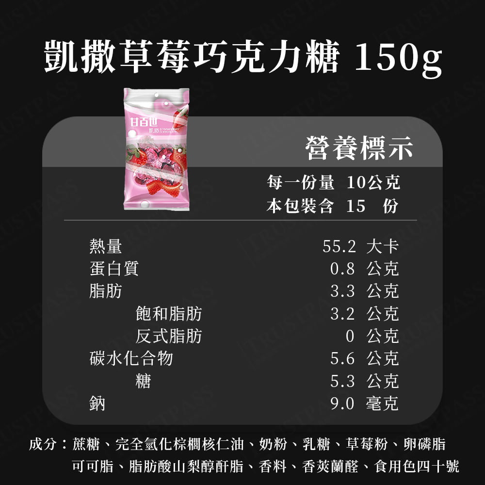 蔗糖、完全氫化棕櫚核仁油、奶粉、乳糖、草莓粉、卵磷脂、可可脂、脂肪酸山梨醇酐脂、香料、香莢蘭醛、食用色四十號鋁麗基 |