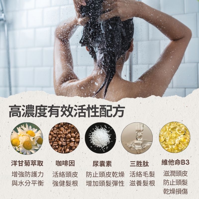 溫和配方結合洋甘菊精萃與維他命B3、三胜肽與咖啡因等多重保養成分,讓秀髮洗後呈現自然蓬鬆、輕盈有型