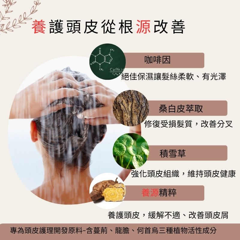 養源精萃內含蔓荊、龍膽、何首烏植物成分,溫柔呵護頭皮,洗後清爽不緊繃