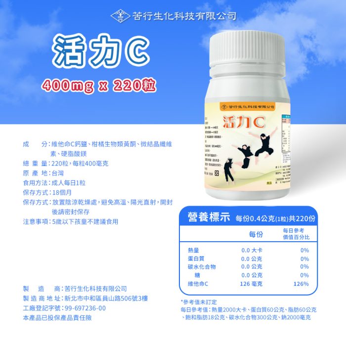 活力C膠囊,每粒含400mg中性維他命C與柑橘生物類黃酮