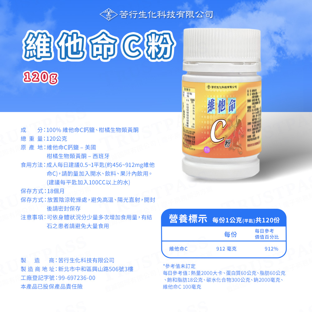 成人每日建議0.5~1平匙(約456~912mg維他命C),請酌量加入開水、飲料、果汁內飲用。(建議每平匙加入100CC以上的水) |