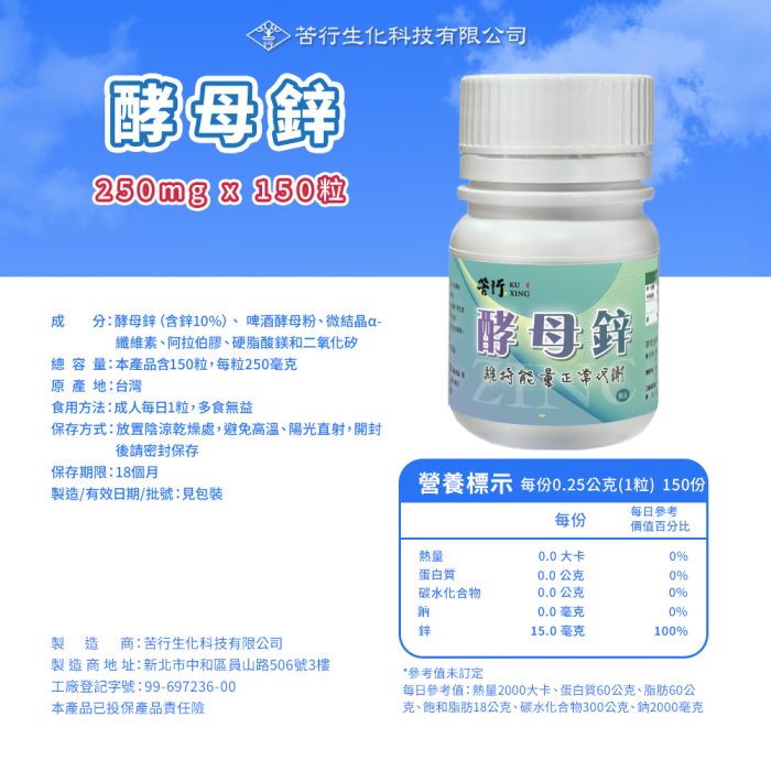 酵母鋅(含鋅10%)、啤酒酵母粉、微結晶α-纖維素、阿拉伯膠、硬脂酸鎂、二氧化矽 |