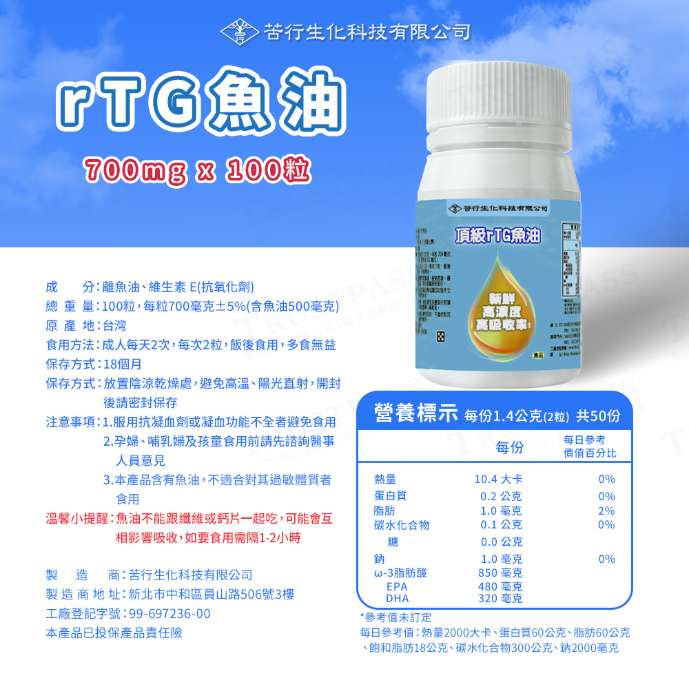 【苦行生化】頂級rTG魚油 (700mg x 100粒)