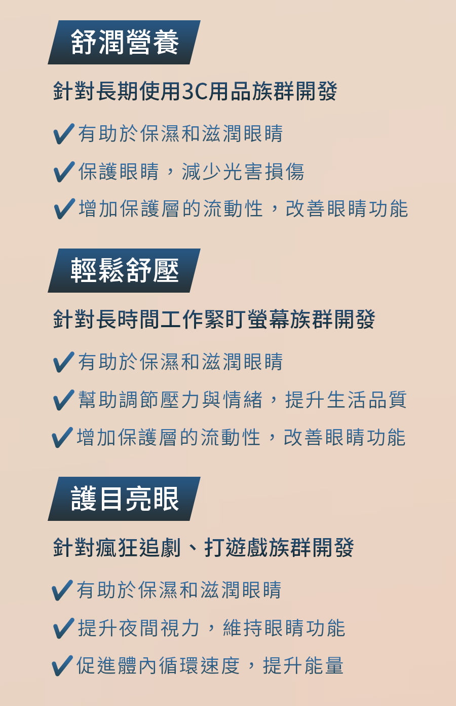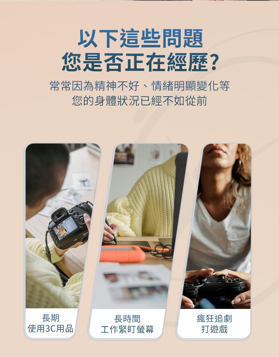 針對長期使用3C & 工作緊盯螢幕 & 追劇、玩遊戲族群開發