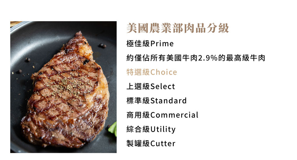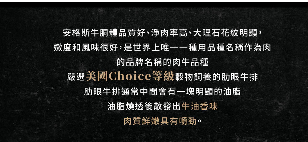 選自美國Choice等級,穀物飼養安格斯牛隻,肉質鮮嫩,油花均勻。