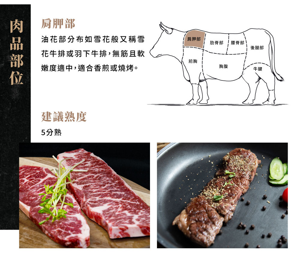 適合香煎或燒烤,口感與無骨牛小排相似,無筋且柔嫩
