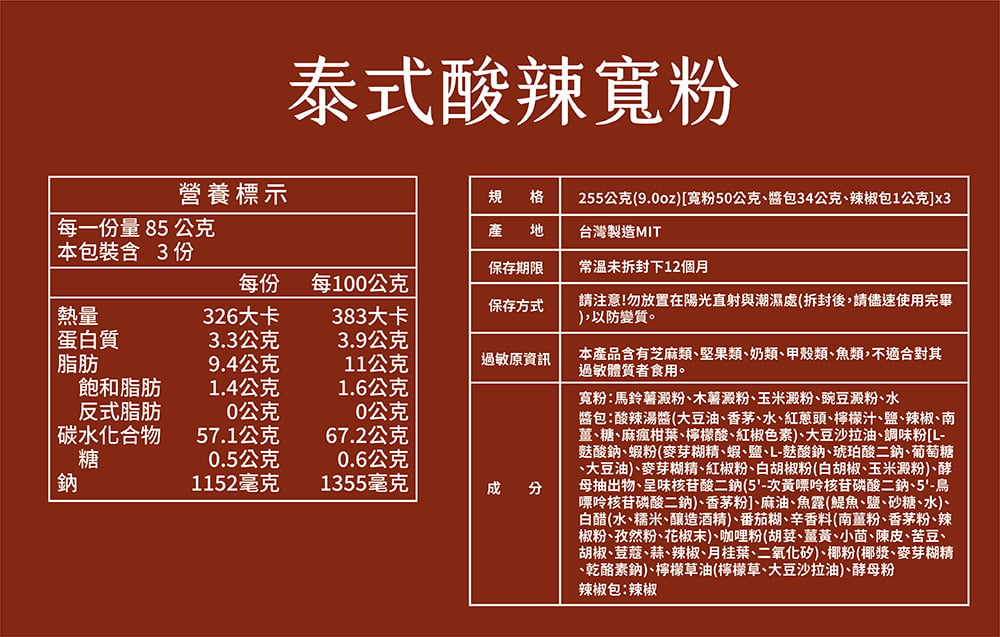 醬包:酸辣湯醬(大豆油、香茅、水、紅蔥頭、檸檬汁、鹽、辣椒、南薑、糖、麻瘋柑葉、檸檬酸、紅椒色素)、大豆沙拉油、調味粉[L-麩酸鈉、蝦粉(麥芽糊精、蝦、鹽、L-麩酸鈉、琥珀酸二鈉、葡萄糖、大豆油)、麥芽糊精、紅椒粉、白胡椒粉(白胡椒、玉米澱粉)、酵母抽出物、呈味核苷酸二鈉( 5'-次黃嘌呤核苷磷酸二鈉、5'-鳥嘌呤核苷磷酸二鈉)、香茅粉] 、麻油、魚露(鯷魚、鹽、砂糖、水)、白醋(水、糯米、釀造酒精)、番茄糊、辛香料(南薑粉、香茅粉、辣椒粉、孜然粉、花椒末)、咖哩粉(胡荽、薑黃、小茴、陳皮、苦豆、胡椒、荳蔻、蒜、辣椒、月桂葉、二氧化矽)、椰粉(椰漿、麥芽糊精、乾酪素鈉)、 檸檬草油(檸檬草、大豆沙拉油)、酵母粉。 辣椒包:辣椒 |