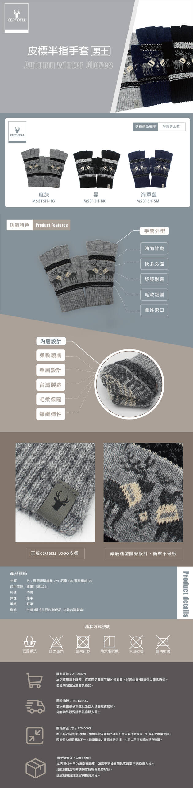 【Cerf Bell 瑟夫貝爾】男麋鹿CB皮標半指手套
