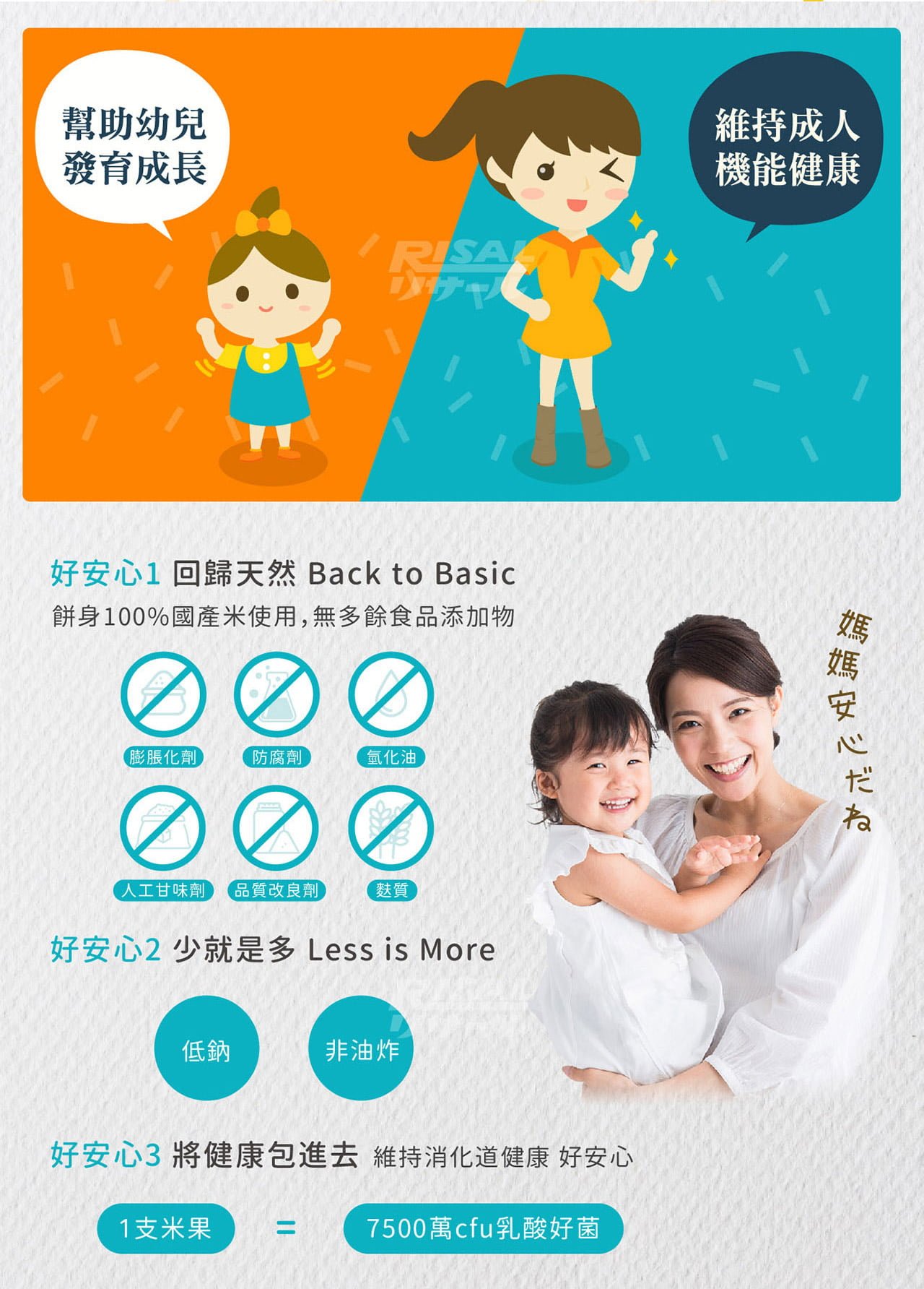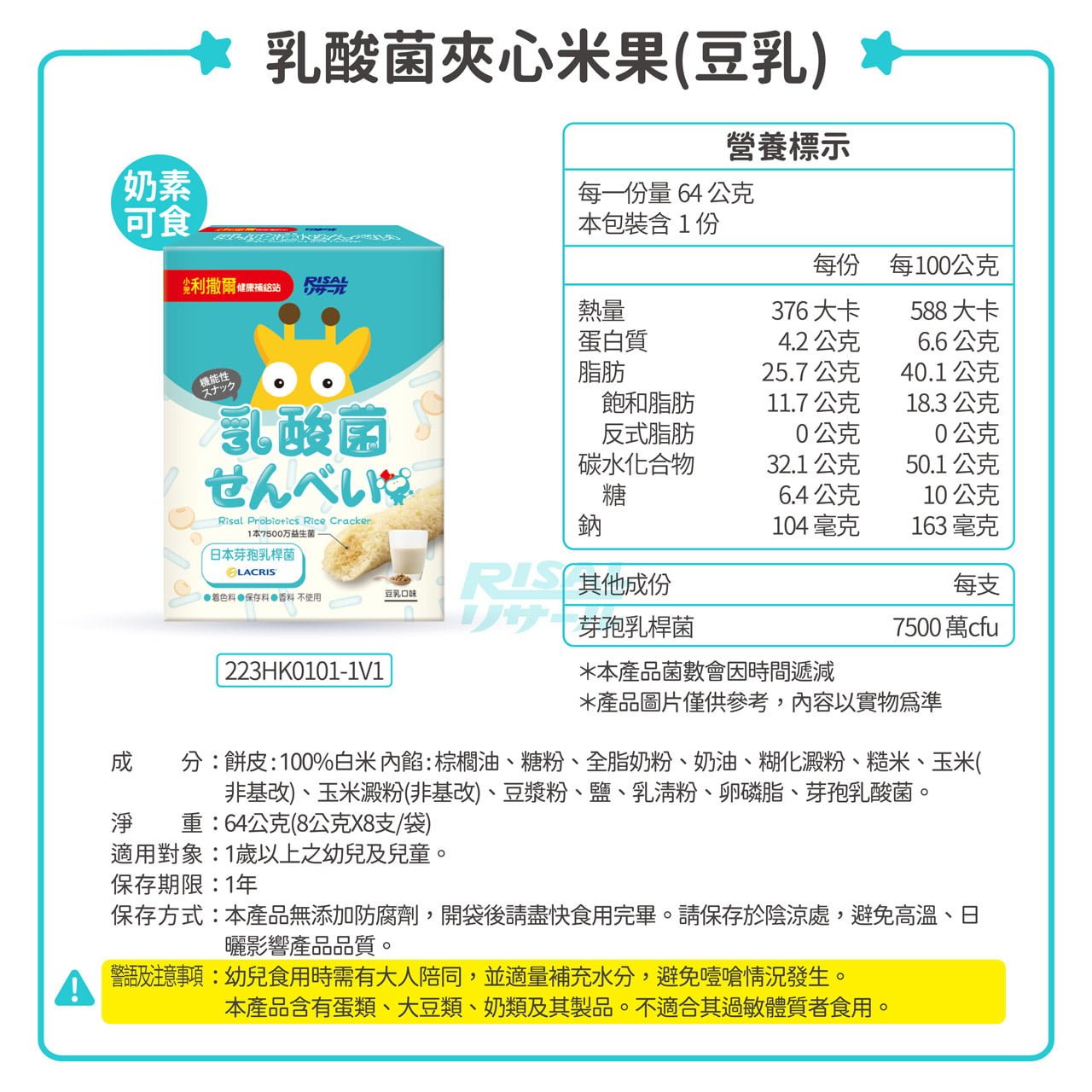 白米(100%)、棕櫚油、蛋黃粉、糖粉、葡萄糖、全脂奶粉、糙米、玉米非基改、玉米澱粉非基改、乳清粉、糊化澱粉、鹽、芽孢乳酸菌 |