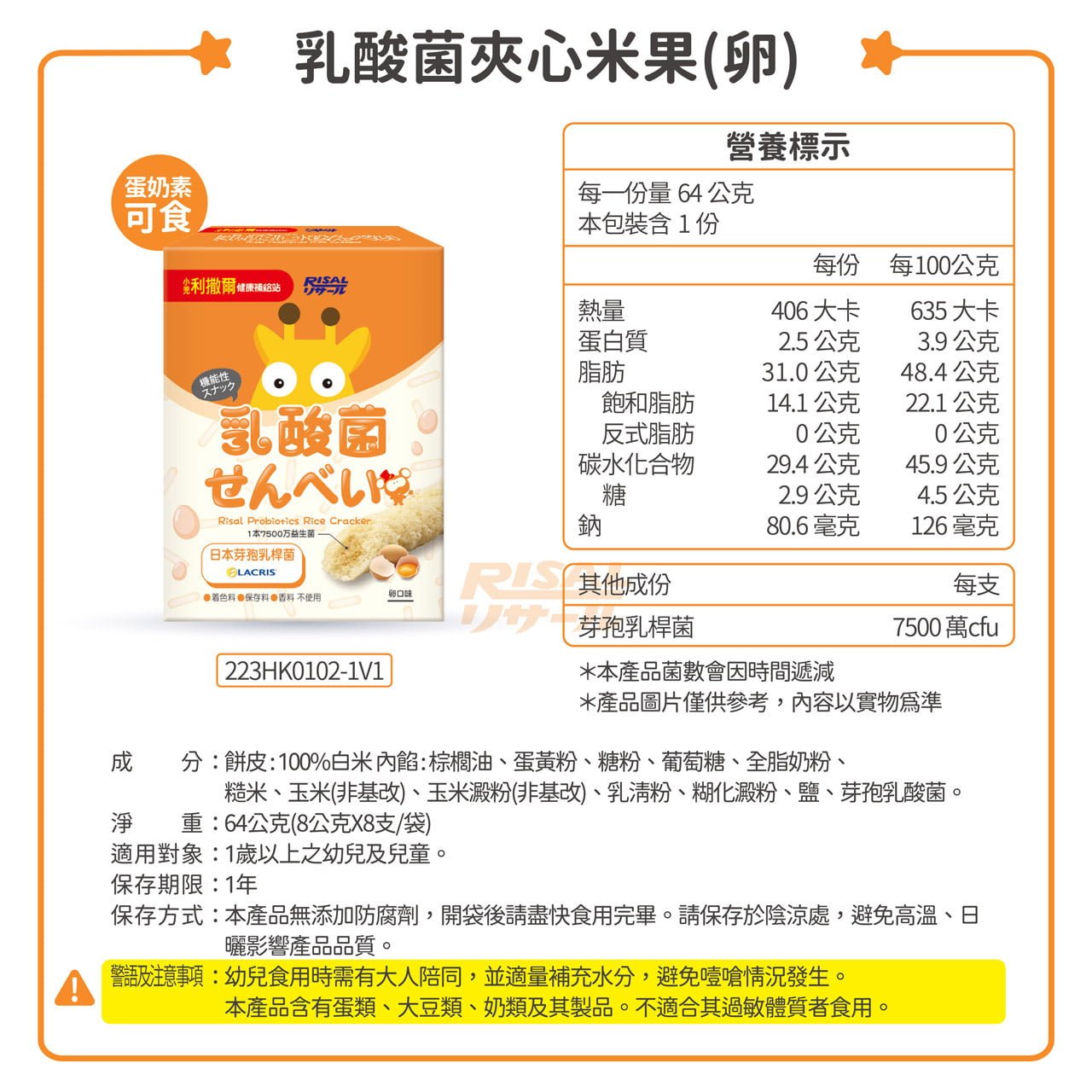 【RISAL小兒利撒爾】啾米乳酸菌夾心米果 卵 8入