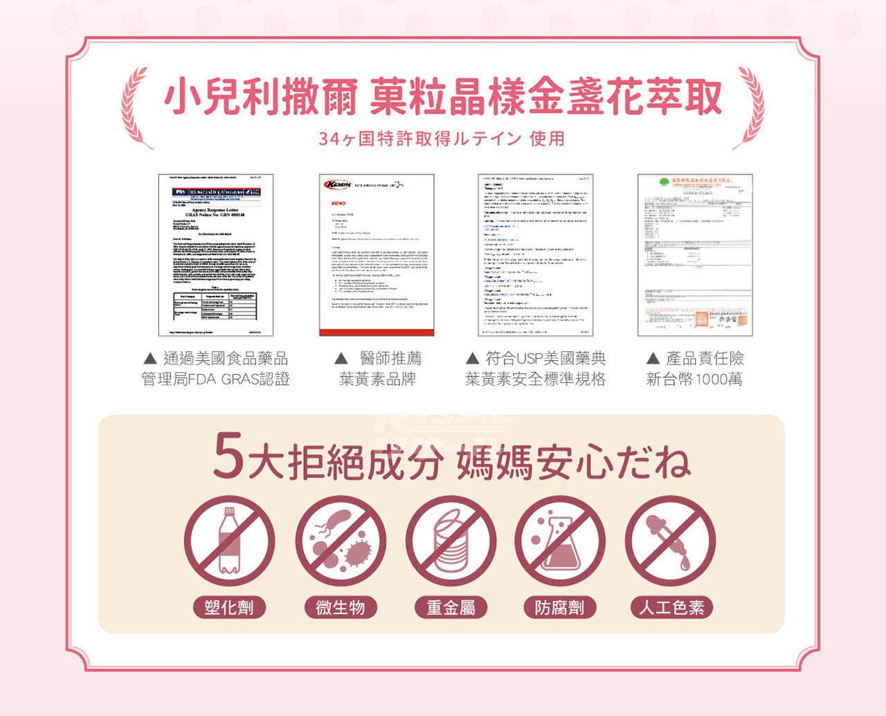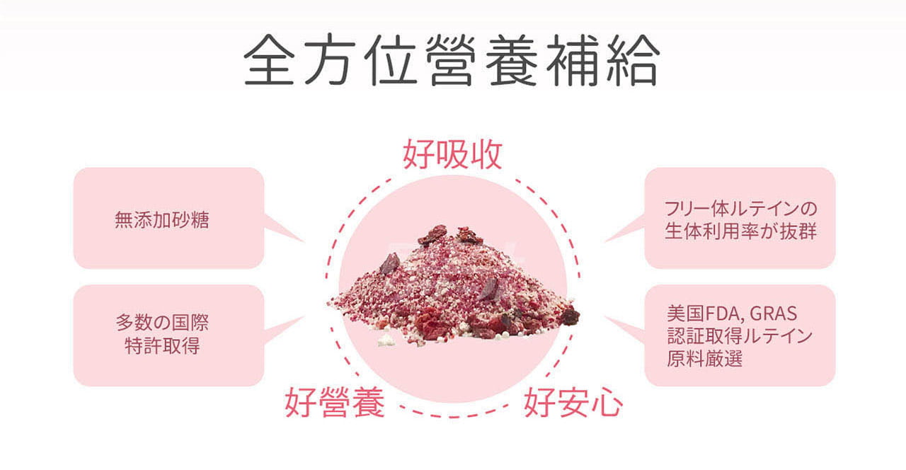 專利糊精纖維(水溶性膳食纖維)、藍莓果汁粉(蔗糖、藍莓果汁粉、玉米澱粉)、碳酸鈣、蔓越莓果乾、FloraGlo葉黃素(辛烯基丁二酸鈉澱粉、葡萄糖、蔗糖、葉黃素(金盞花萃取物)、維生素C、水)、金盞花萃取(含玉米黃素10%)、藻油粉(DHA藻油、葡萄糖漿、大豆蛋白、葵花油、維生素C、卵磷脂)、枸杞萃取物(枸杞萃取物、麥芽糊精)、二氧化矽、檸檬酸、流行鏈球菌發酵物(含透明質酸)、維生素A(明膠、玉米澱粉、維生素A醋酸鹽、蔗糖) |