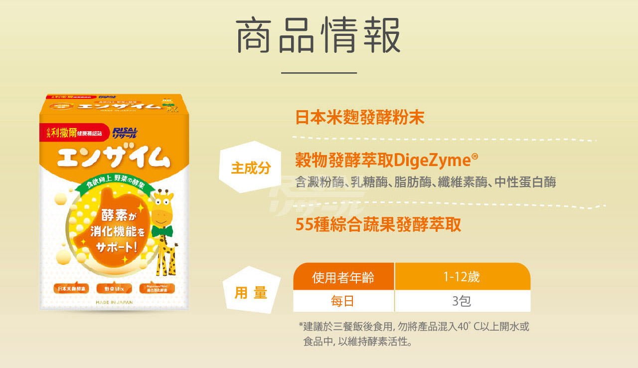 1到12歲每回1包,每日3回。建議於三餐飯後食用,輔助維持消化機能 |