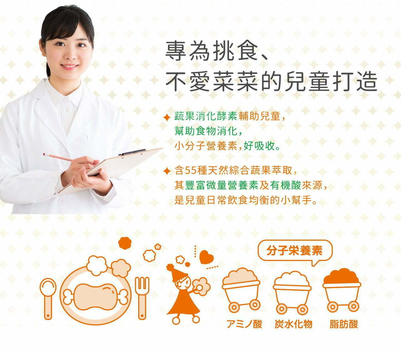 ✔️含56種天然綜合蔬果萃取,其豐富微量營養素及有機酸來源,是兒童日常飲食均衡的小幫手。