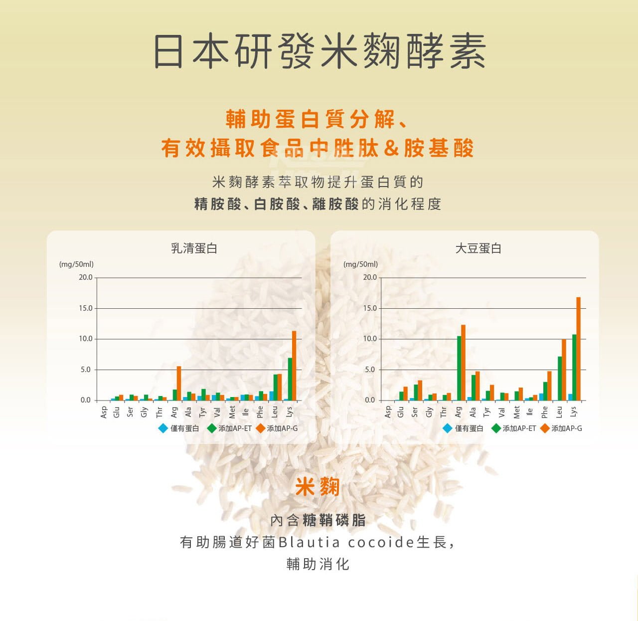 ✔️嚴選日本研發米麴酵素,強化蛋白質分解,有利多元胺基酸攝取與吸收。
