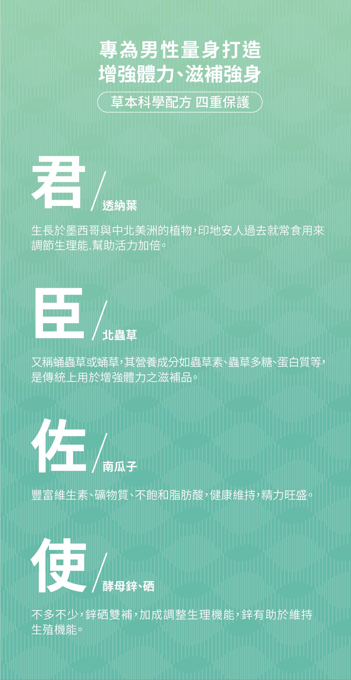 透納葉、蛹蟲草菌絲體、鋅酵母、硒酵母、南瓜子萃取、麥芽糊精、硬脂酸鎂 |