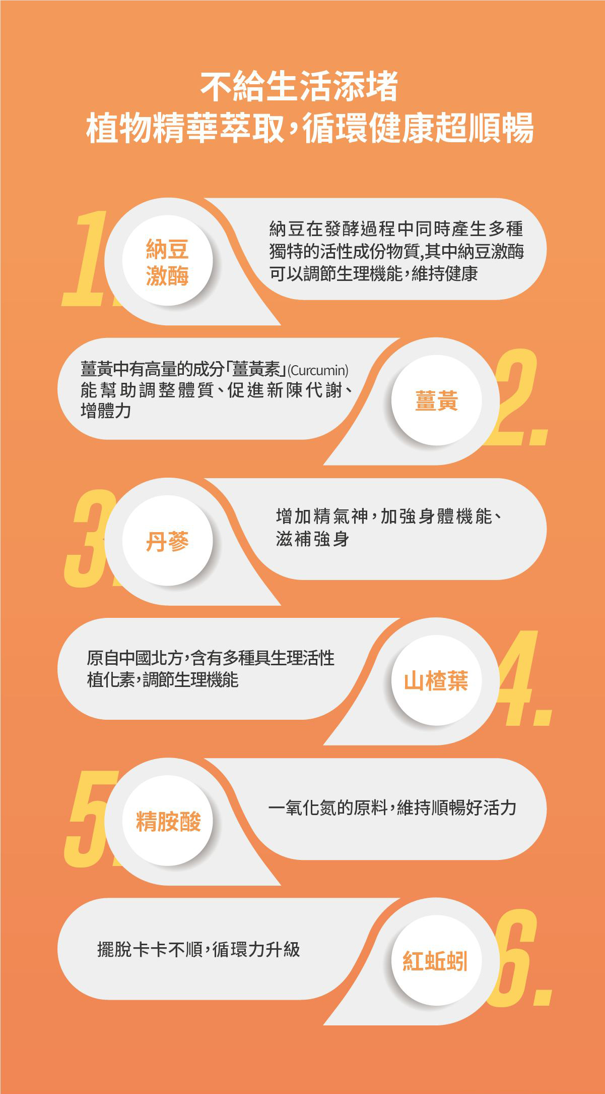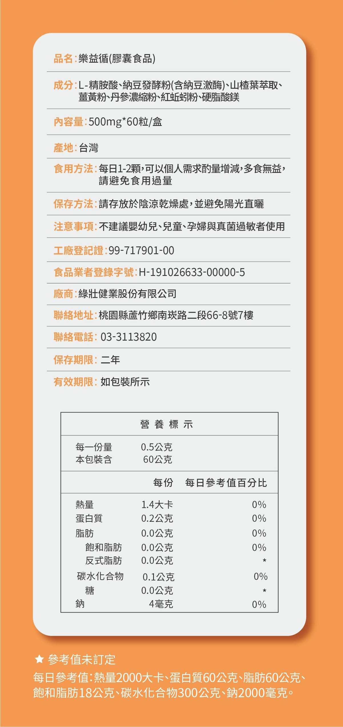 L-精胺酸、納豆發酵粉(含納豆激酶)、山楂葉萃取、薑黃粉、丹麥濃縮粉、紅蚯蚓粉、硬脂酸鎂 |